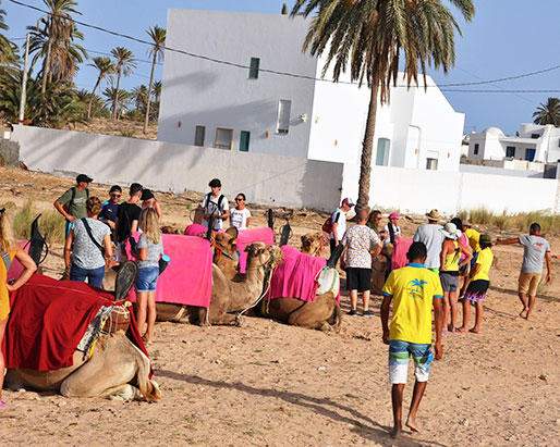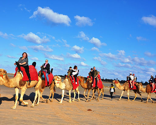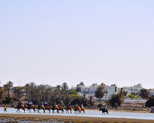 A dos de dromadaire ou à cheval, découvrez le cœur de l’île de Djerba ! La balade à dos de dromadaire ou à cheval est un des meilleurs moyens de découvrir le cœur de l’île de Djerba. Les possibilités de monter à cheval ou à dromadaire sont nombreuses à Djerba. Toutefois, les amateurs de nouvelles sensations n’hésiteront pas à découvrir le charme du rythme chaloupé de la démarche du « vaisseau du désert ». Le dromadaire, élancé et rustique, habitué à marcher dans le sable, clair comme les dunes du désert, est parfaitement adapté pour vous faire découvrir les pistes sablonneuses de l’île de Djerba. Les amateurs de confort préféreront faire la promenade à cheval, bien calés sur une selle. Vous pouvez aussi essayer les deux (cheval, dromadaire )dans la même balade (aller sur cheval et retour sur dromadaire ou l’inverse )